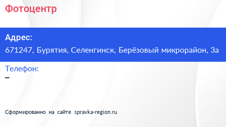 Фотоцентр по адресу 671247, Бурятия, Селенгинск, Берёзовый микрорайон, 3а в дальнейшем Организация, размещена в следующих категориях: