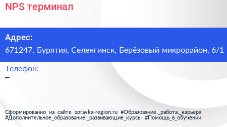 NPS, терминал по адресу 671247, Бурятия, Селенгинск, Берёзовый микрорайон, 6/1 в дальнейшем Организация, размещена в следующих категориях: