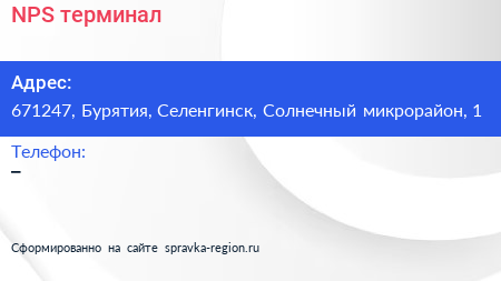 NPS, терминал по адресу 671247, Бурятия, Селенгинск, Солнечный микрорайон, 1 в дальнейшем Организация, размещена в следующих категориях: