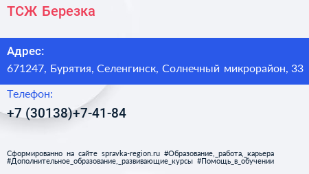 ТСЖ Березка по адресу 671247, Бурятия, Селенгинск, Солнечный микрорайон, 33 в дальнейшем Организация, размещена в следующих категориях: