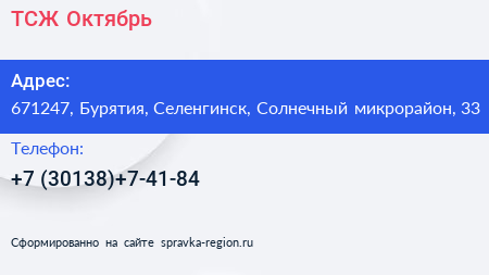 ТСЖ Октябрь по адресу 671247, Бурятия, Селенгинск, Солнечный микрорайон, 33 в дальнейшем Организация, размещена в следующих категориях: