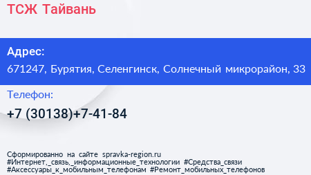 ТСЖ Тайвань по адресу 671247, Бурятия, Селенгинск, Солнечный микрорайон, 33 в дальнейшем Организация, размещена в следующих категориях:
