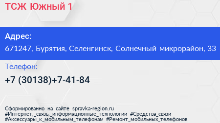 ТСЖ Южный-1 по адресу 671247, Бурятия, Селенгинск, Солнечный микрорайон, 33 в дальнейшем Организация, размещена в следующих категориях: