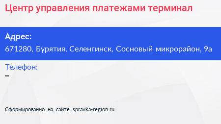 Центр управления платежами, терминал по адресу 671280, Бурятия, Селенгинск, Сосновый микрорайон, 9а в дальнейшем Организация, размещена в следующих категориях: