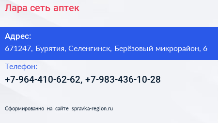 Лара, сеть аптек по адресу 671247, Бурятия, Селенгинск, Берёзовый микрорайон, 6 в дальнейшем Организация, размещена в следующих категориях: