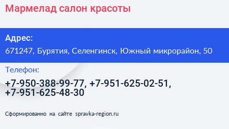 Мармелад, салон красоты по адресу 671247, Бурятия, Селенгинск, Южный микрорайон, 50 в дальнейшем Организация, размещена в следующих категориях:
