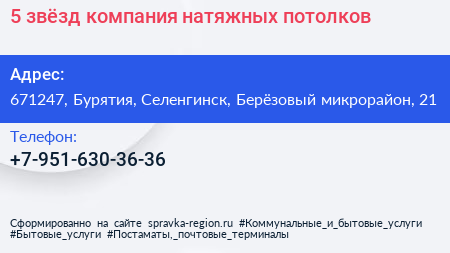 5 звёзд, компания натяжных потолков по адресу 671247, Бурятия, Селенгинск, Берёзовый микрорайон, 21 в дальнейшем Организация, размещена в следующих категориях: