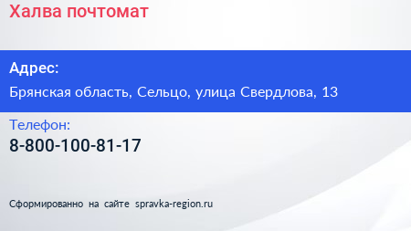 Халва, почтомат по адресу Брянская область, Сельцо, улица Свердлова, 13 в дальнейшем Организация, размещена в следующих категориях:
