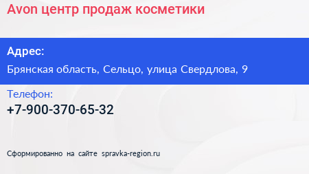 Avon, центр продаж косметики по адресу Брянская область, Сельцо, улица Свердлова, 9 в дальнейшем Организация, размещена в следующих категориях: