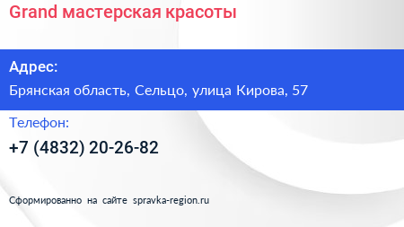 Grand, мастерская красоты по адресу Брянская область, Сельцо, улица Кирова, 57 в дальнейшем Организация, размещена в следующих категориях: