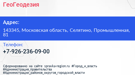 ГеоГеодезия по адресу 143345, Московская область, Селятино, Промышленная, 81 в дальнейшем Организация, размещена в следующих категориях: