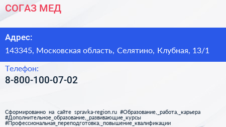 СОГАЗ-МЕД по адресу 143345, Московская область, Селятино, Клубная, 13/1 в дальнейшем Организация, размещена в следующих категориях: