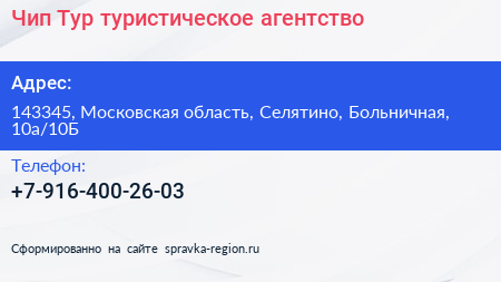 Чип Тур, туристическое агентство по адресу 143345, Московская область, Селятино, Больничная, 10а/10Б в дальнейшем Организация, размещена в следующих категориях: