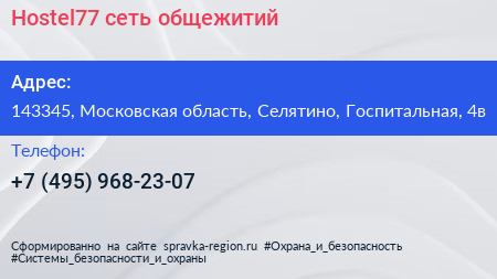 Hostel77, сеть общежитий по адресу 143345, Московская область, Селятино, Госпитальная, 4в в дальнейшем Организация, размещена в следующих категориях: