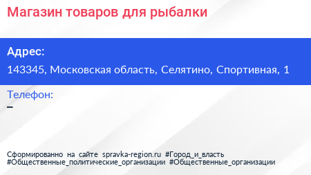 Магазин товаров для рыбалки по адресу 143345, Московская область, Селятино, Спортивная, 1 в дальнейшем Организация, размещена в следующих категориях:
