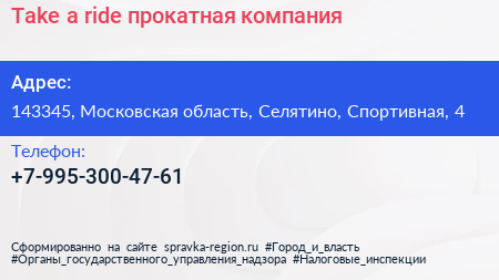 Take a ride, прокатная компания по адресу 143345, Московская область, Селятино, Спортивная, 4 в дальнейшем Организация, размещена в следующих категориях: