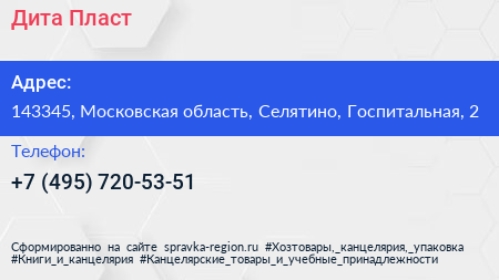 Дита-Пласт по адресу 143345, Московская область, Селятино, Госпитальная, 2 в дальнейшем Организация, размещена в следующих категориях: