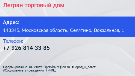 Легран, торговый дом по адресу 143345, Московская область, Селятино, Вокзальная, 1 в дальнейшем Организация, размещена в следующих категориях: