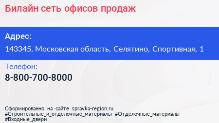 Билайн, сеть офисов продаж по адресу 143345, Московская область, Селятино, Спортивная, 1 в дальнейшем Организация, размещена в следующих категориях: