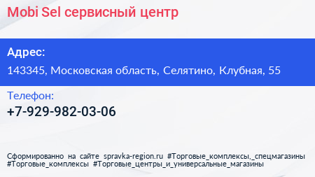 Mobi-Sel, сервисный центр по адресу 143345, Московская область, Селятино, Клубная, 55 в дальнейшем Организация, размещена в следующих категориях: