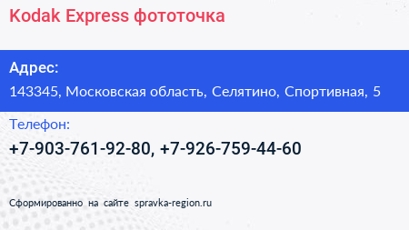 Kodak Express, фототочка по адресу 143345, Московская область, Селятино, Спортивная, 5 в дальнейшем Организация, размещена в следующих категориях: