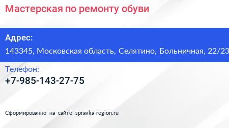 Мастерская по ремонту обуви по адресу 143345, Московская область, Селятино, Больничная, 22/23 в дальнейшем Организация, размещена в следующих категориях: