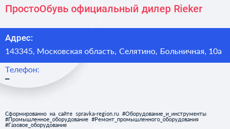 ПростоОбувь, официальный дилер Rieker по адресу 143345, Московская область, Селятино, Больничная, 10а в дальнейшем Организация, размещена в следующих категориях: