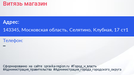 Витязь, магазин по адресу 143345, Московская область, Селятино, Клубная, 17 ст1 в дальнейшем Организация, размещена в следующих категориях: