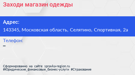 Заходи, магазин одежды по адресу 143345, Московская область, Селятино, Спортивная, 2а в дальнейшем Организация, размещена в следующих категориях: