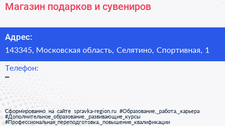 Магазин подарков и сувениров по адресу 143345, Московская область, Селятино, Спортивная, 1 в дальнейшем Организация, размещена в следующих категориях: