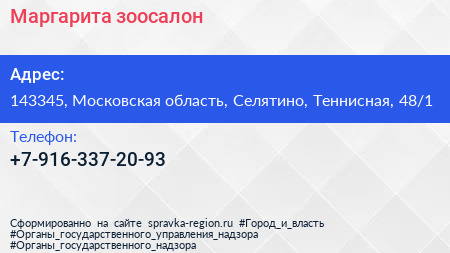 Маргарита, зоосалон по адресу 143345, Московская область, Селятино, Теннисная, 48/1 в дальнейшем Организация, размещена в следующих категориях: