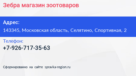 Зебра, магазин зоотоваров по адресу 143345, Московская область, Селятино, Спортивная, 2 в дальнейшем Организация, размещена в следующих категориях: