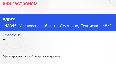 888, гастроном по адресу 143345, Московская область, Селятино, Теннисная, 48/2 в дальнейшем Организация, размещена в следующих категориях: