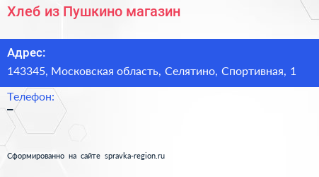 Хлеб из Пушкино, магазин по адресу 143345, Московская область, Селятино, Спортивная, 1 в дальнейшем Организация, размещена в следующих категориях: