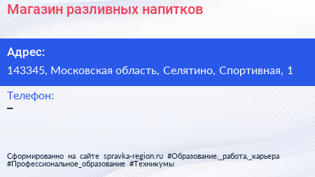 Магазин разливных напитков по адресу 143345, Московская область, Селятино, Спортивная, 1 в дальнейшем Организация, размещена в следующих категориях: