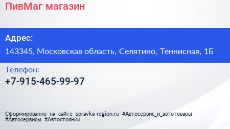ПивМаг, магазин по адресу 143345, Московская область, Селятино, Теннисная, 1Б в дальнейшем Организация, размещена в следующих категориях: