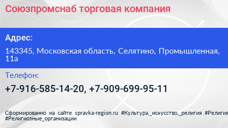 Союзпромснаб, торговая компания по адресу 143345, Московская область, Селятино, Промышленная, 11а в дальнейшем Организация, размещена в следующих категориях:
