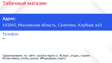 Табачный магазин по адресу 143345, Московская область, Селятино, Клубная, вл3 в дальнейшем Организация, размещена в следующих категориях: