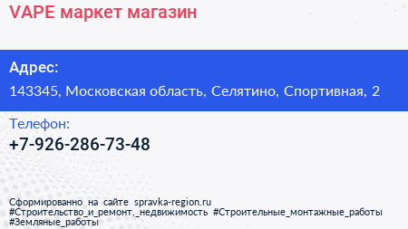 VAPE-маркет, магазин по адресу 143345, Московская область, Селятино, Спортивная, 2 в дальнейшем Организация, размещена в следующих категориях: