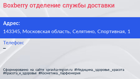 Boxberry, отделение службы доставки по адресу 143345, Московская область, Селятино, Спортивная, 1 в дальнейшем Организация, размещена в следующих категориях: