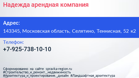 Надежда, арендная компания по адресу 143345, Московская область, Селятино, Теннисная, 52 к2 в дальнейшем Организация, размещена в следующих категориях: