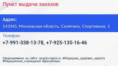 Пункт выдачи заказов по адресу 143345, Московская область, Селятино, Спортивная, 1 в дальнейшем Организация, размещена в следующих категориях: