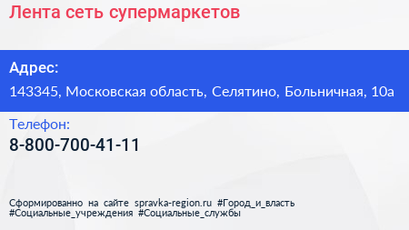 Лента, сеть супермаркетов по адресу 143345, Московская область, Селятино, Больничная, 10а в дальнейшем Организация, размещена в следующих категориях: