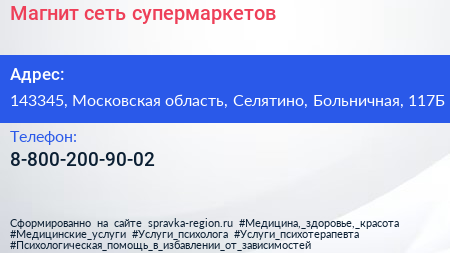 Магнит, сеть супермаркетов по адресу 143345, Московская область, Селятино, Больничная, 117Б в дальнейшем Организация, размещена в следующих категориях: