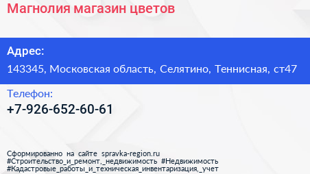 Магнолия, магазин цветов по адресу 143345, Московская область, Селятино, Теннисная, ст47 в дальнейшем Организация, размещена в следующих категориях: