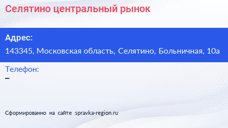 Селятино, центральный рынок по адресу 143345, Московская область, Селятино, Больничная, 10а в дальнейшем Организация, размещена в следующих категориях: