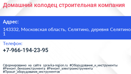 Домашний колодец, строительная компания по адресу 143332, Московская область, Селятино, деревня Селятино, 1 в дальнейшем Организация, размещена в следующих категориях: