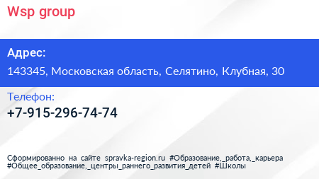 Wsp-group по адресу 143345, Московская область, Селятино, Клубная, 30 в дальнейшем Организация, размещена в следующих категориях: