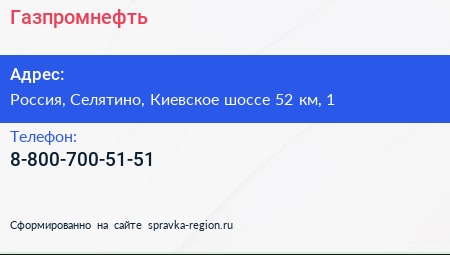Газпромнефть по адресу Газпромнефть, Киевское шоссе, посёлок дома отдыха "Отличник", Наро-Фоминский городской округ, Московская область, Центральный федеральный округ, 143345, Россия в дальнейшем Организация, размещена в следующих категориях: