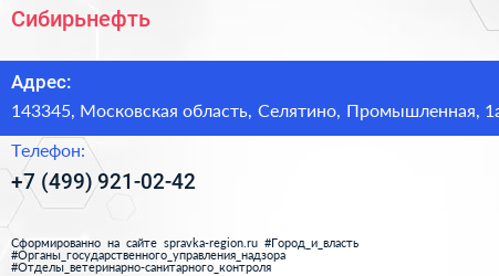 Сибирьнефть по адресу 143345, Московская область, Селятино, Промышленная, 1а в дальнейшем Организация, размещена в следующих категориях: